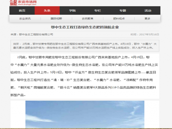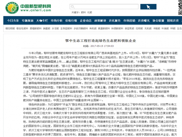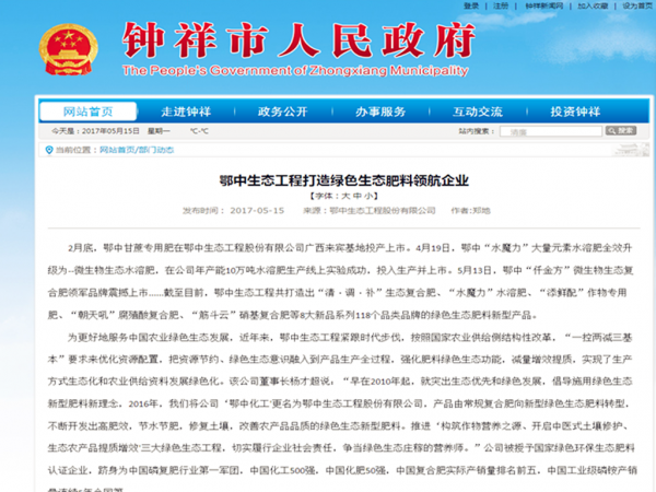 《農資與市場》.《中國新型肥料網》.《鐘祥市政府網站》.《北方農資》:鄂中生態工程打造綠色生態肥料領航企業