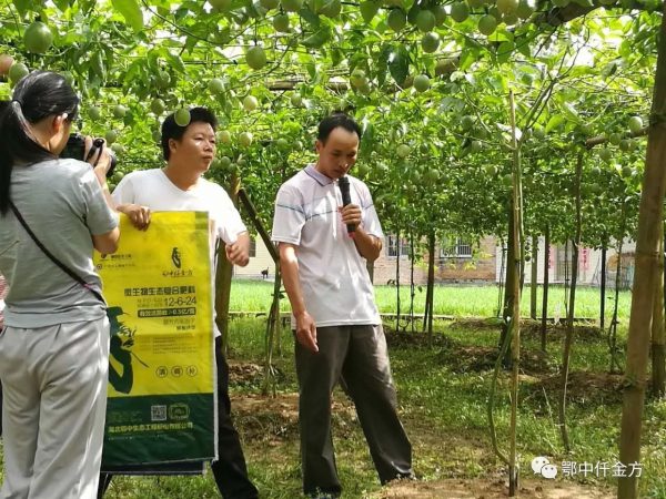 黨海榮現(xiàn)場傳播仟金方肥效:去年我的百香果每畝產(chǎn)量平均在5000斤左右,今年施用鄂中仟金方微生物生態(tài)復合肥,預計每畝增產(chǎn)1200斤左右,多增收3500元左右,穩(wěn)獲高產(chǎn)。黨海榮還介紹了示范田和對照田施肥情況:在1畝示范田7月26日施鄂中仟金方硫酸鉀型42%(12-6-24),0.5斤/株,環(huán)狀溝施,一年生樹,施肥后15天再施第二次。在1畝對照田里,土壤和樹勢基本一樣,7月26號開始施用其它品牌硫基45%(15-15-15),0.5斤/株,環(huán)狀溝施,一年生樹,施肥后15天再施第二次,連續(xù)施用4次后對比,鄂中仟金方效果明顯。